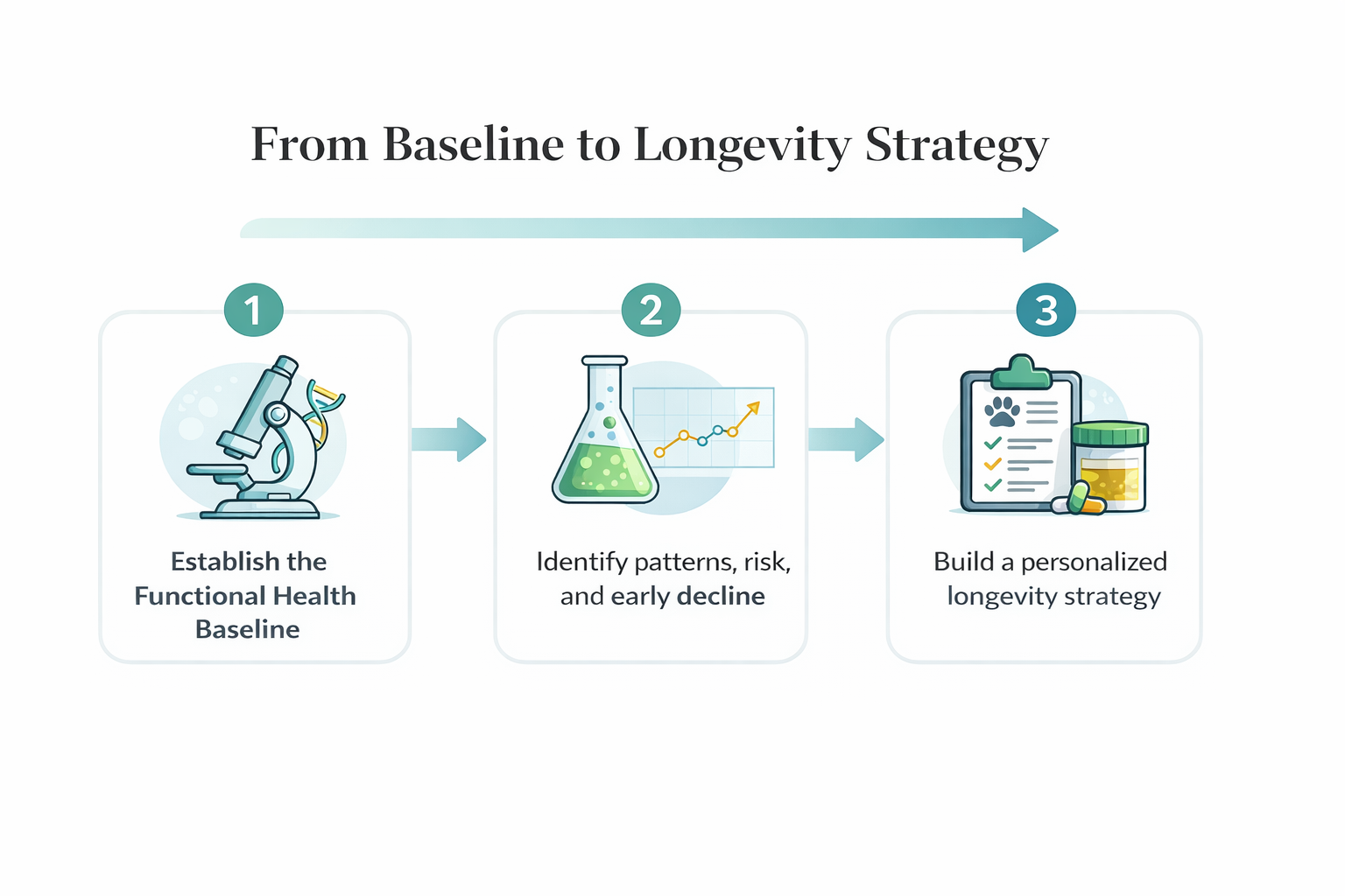 Longevity Care is only possible when we understand how your pet’s systems are functioning before disease appears. Functional Health Baselines provide the biological map that makes longevity strategy precise instead of speculative.